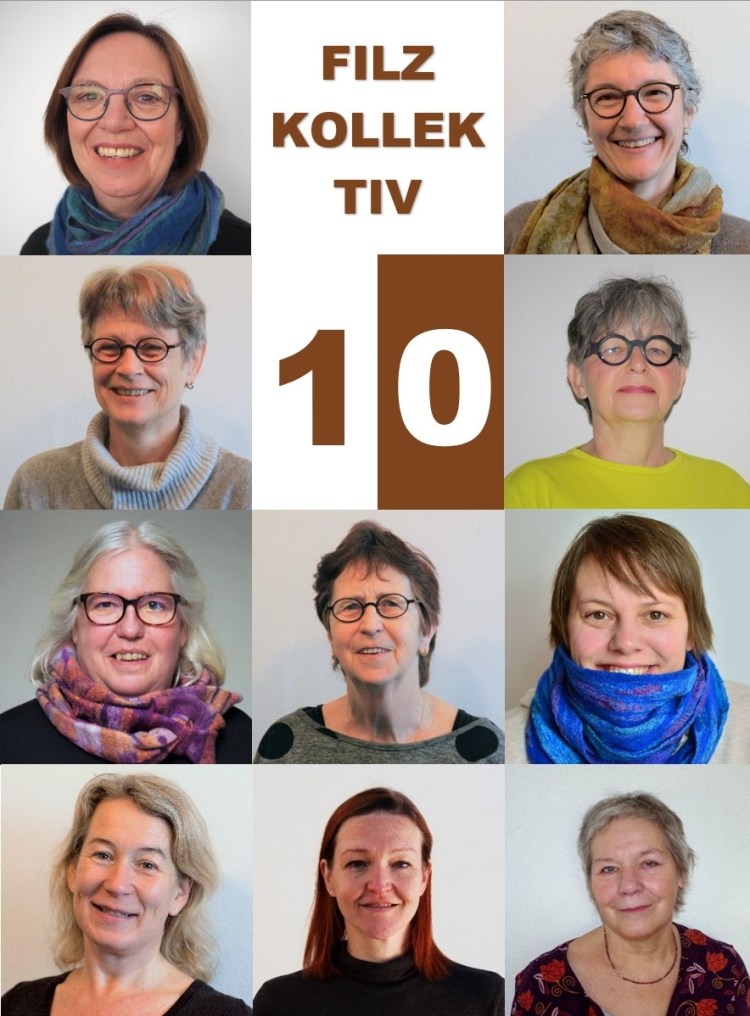 Das Filzkollektiv ist eine Gruppe von 9 filzbegeisterten Frauen, das sich 2018 gegründet hat. Wir haben alle die Ausbildung zur Filzgestalterin zusammen abgeschlossen. Ziel unserer Gruppe ist Filz durch gemeinsame Ausstellungen einen breiten Publikum näher zu bringen. Zu unserem Glück konnten wir die Dozentin Lyda Rump (in der Mitte unter der 10) dazu gewinnen uns bei unseren Ausstellungen zu unterstützen. In diesem Sinne eröffneten wir 2019 eine Ausstellung im Freien unter dem Titel: „Lebendig, Vergänglich“ im Schloßpark Pansewitz auf Rügen.